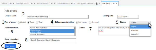 NOTE: these 'groups' are not related to the user role groups seen in ACL contexts. These groups can be used for any kind of group gathering, for any number of patients. They may have assigned to them any number of 'Main Counselors' and any arbitrary list of 'Guest counselors'.
